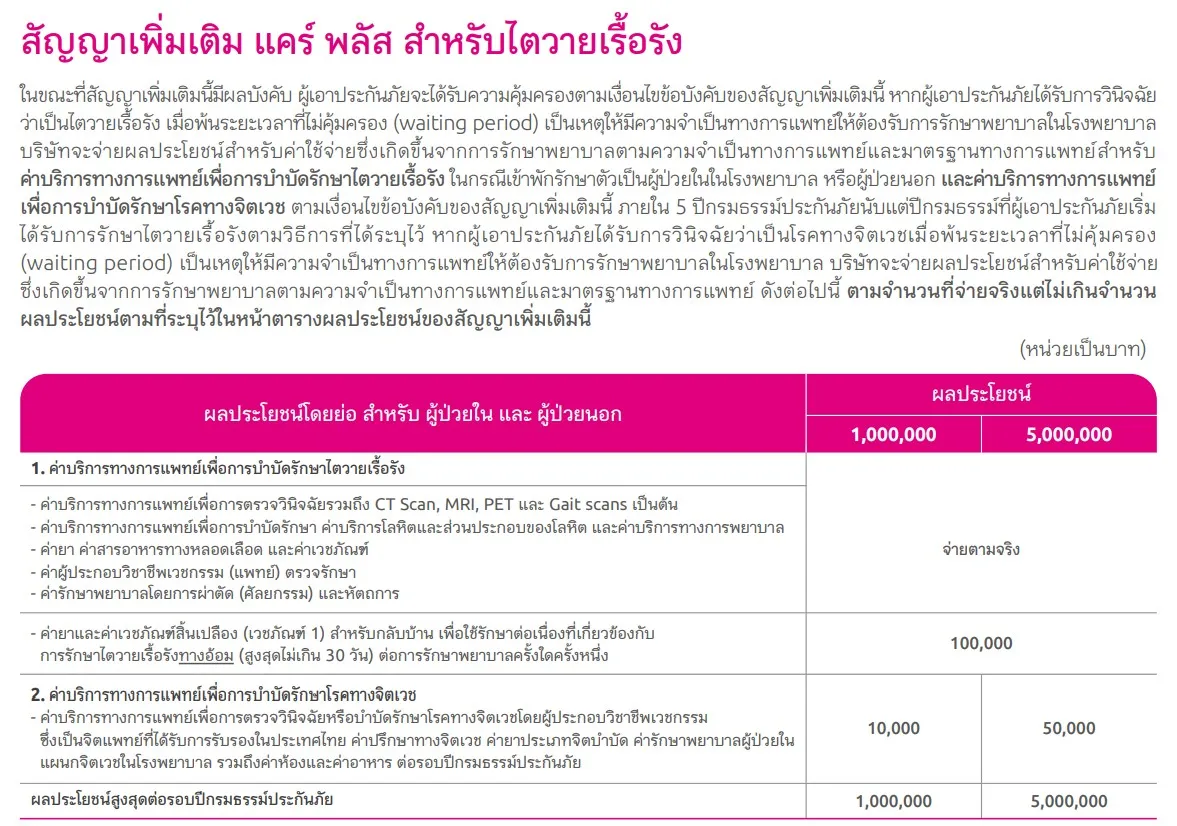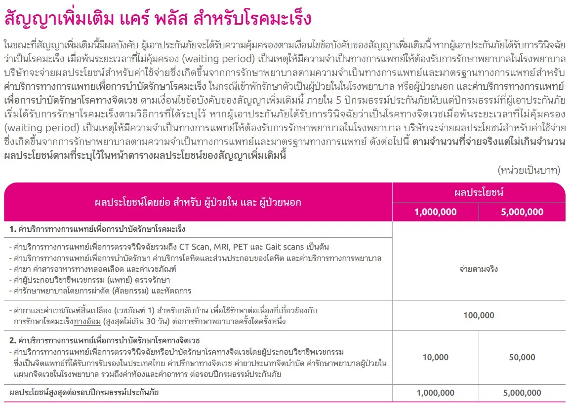 คุ้มครองค่ารักษาพยาบาลผู้ป่วยในและผู้ป่วยนอก โรคมะเร็งและไตวายเรื้อรังทุกระยะ จ่ายเงินค่ารักษาปีละ 5 ล้านบาท